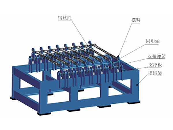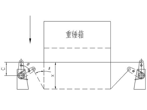 当发生重锤箱下落事故时,,,,重锤箱直接冲击已形成网状的钢丝绳,,由于钢丝绳的两端固定有摆臂,,,随着重物的下落,,钢丝绳拉动两侧摆臂使其绕轴心发生转动,,,,摆臂牵引双扭弹簧发生扭转变形,,,,从而起到吸收能量起到缓冲目的。。在此过程中,,,钢丝绳和双扭弹簧均起到了缓冲作用。。。。从受力的方面分析,,,在重锤箱与钢丝绳接触的同时,,,,钢丝绳的拉力与重锤箱冲击力的合力的大小和方向都将发生改变,,,更为有效的减小了对楼板的冲击。。。